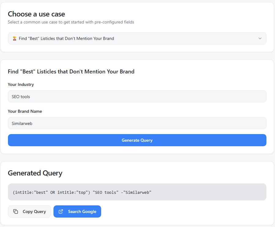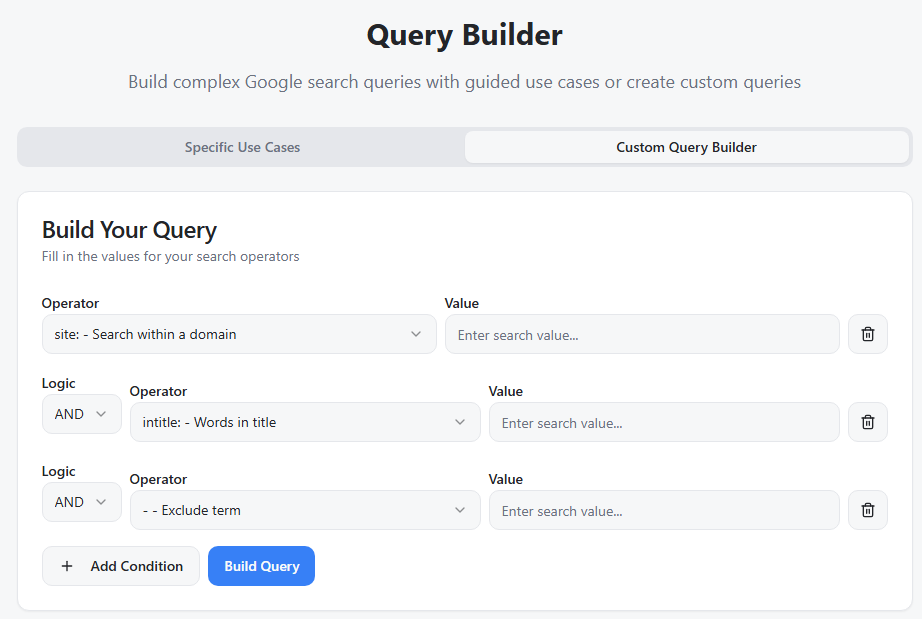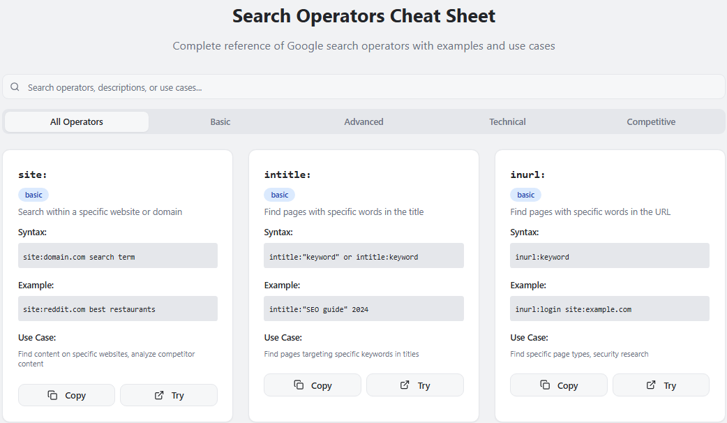 SEO Scout - built out of pure hatred and annoyance. No sign-ups and free access to advanced search operators, comprehensive cheat sheets, and an intelligent query builder.
