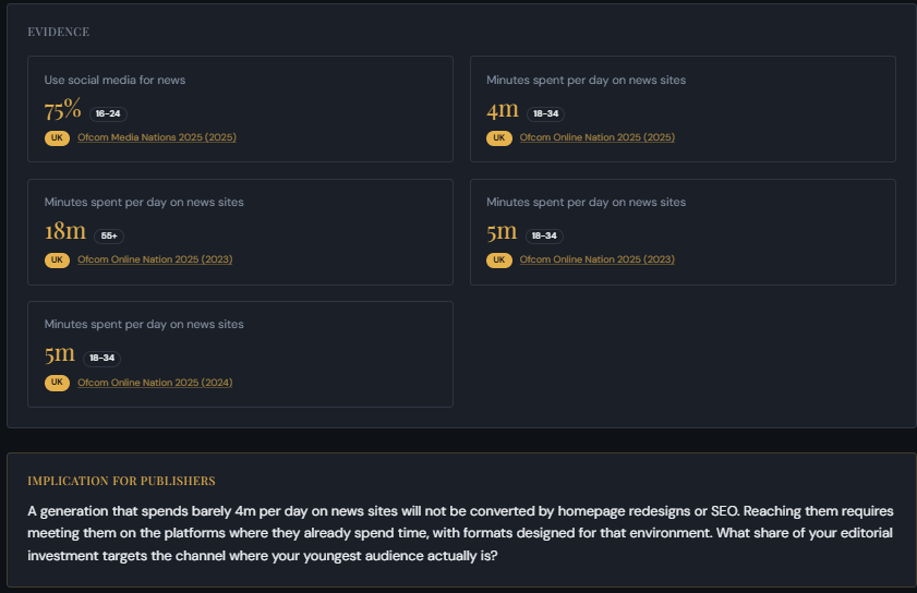 Particularly if you’re still just copying headers and FAQs from the top three results. Audiences are not arriving at publisher destinations through direct navigation at the same scale. They encounter journalism incidentally, through social feeds, not through habitual site visits.