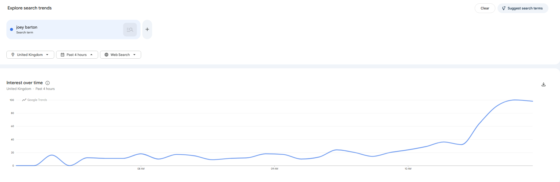 Joey Barton is currently trending because he’s been arrested. Again. Over the last four hours the trend has skyrocketed and the straight story has been covered by multiple, very large outlets.